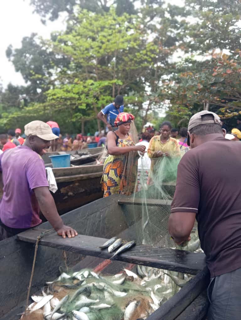 Un petit tour au bout du village, plus précisément sur les lieux du débarcadère appelé « Manga ma Djao », là où la rivière Likodo qui alimente les sources d’eau douce du village, se jette à l’Océan Atlantique. Ce samedi matin, la plage est très animée, les habitants sont massés par dessus les pirogues, pour effectuer un mouvement automatique qui semble facile mais pas tant que ça. Il s’agit de démailler les poissons pris dans les filets de pêche. Nos premières tentatives pour retirer les poissons semblent ardues, tant les poissons sont bien incrustés entre les mailles du filet. Dida , tout souriant, un pêcheur expérimenté, nous lance au loin: « on sent que vous n’avez pas l’habitude, mais si vous continuez comme ça, vous risquez de vous blesser, il vaut mieux laisser ». Nous ne l’entendons pas de cette oreille, voyant notre engagement à nous tordre les doigts devant la dextérité des autres, une petite main experte se glisse à notre portée.